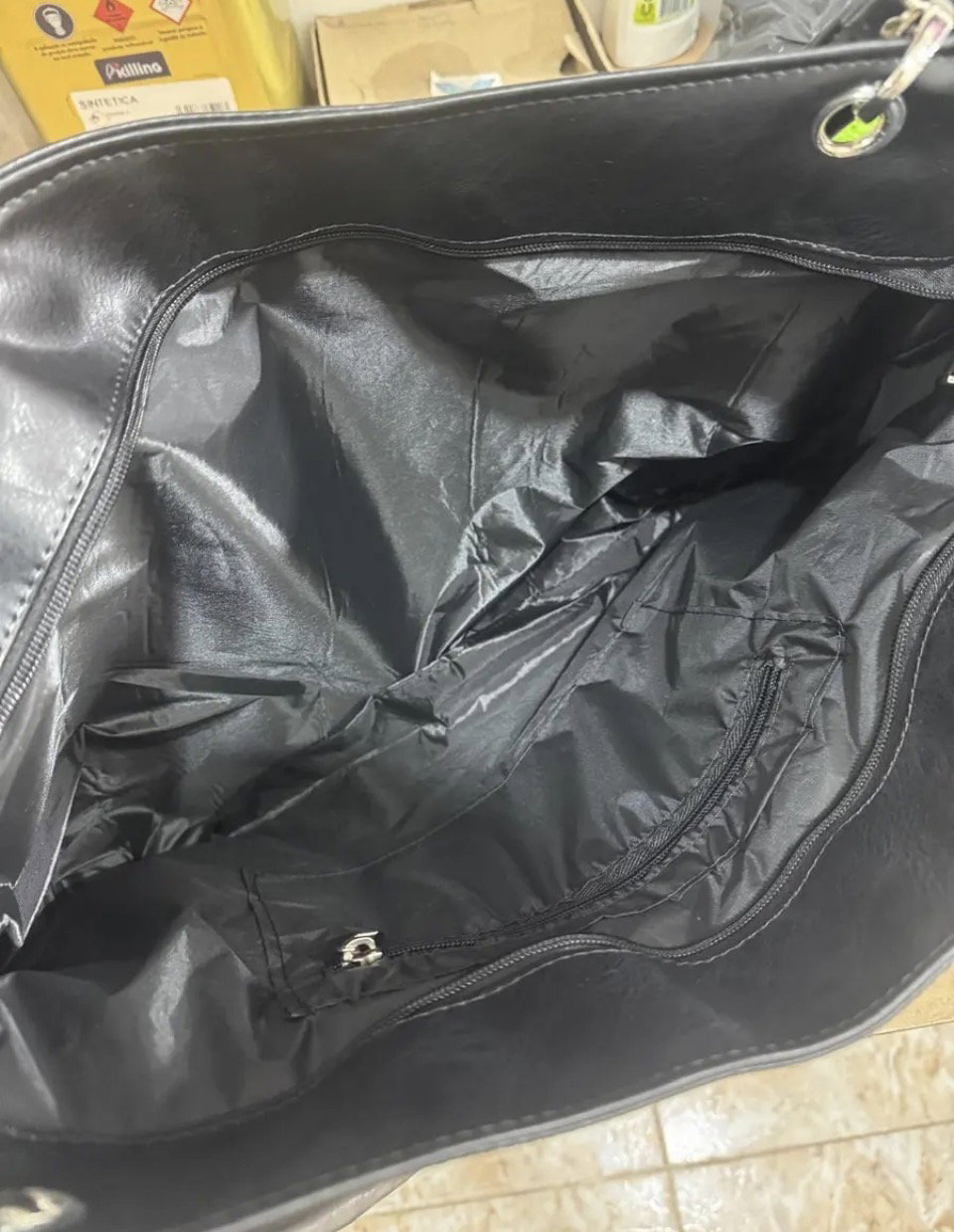 Material simil cuero pu, herrajes color niquel, toda forrada en su interior con tela silver impermeable y bolsillo interno con cierre .