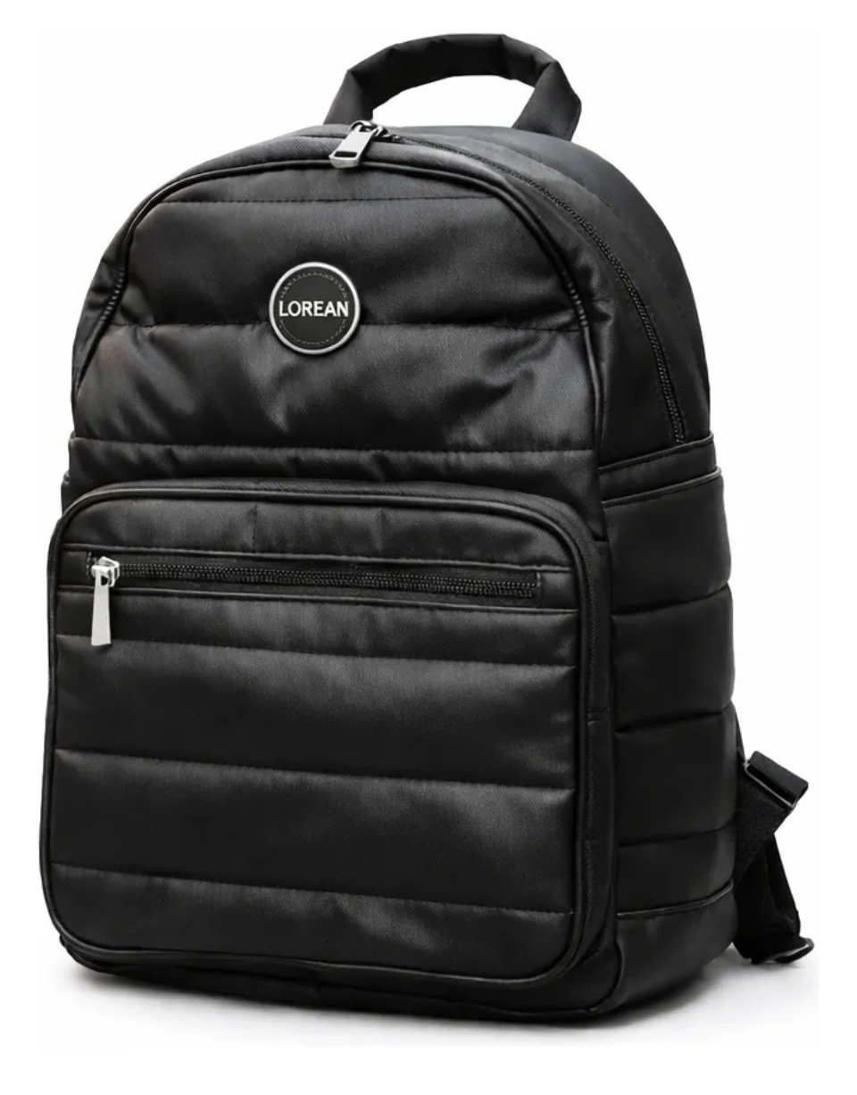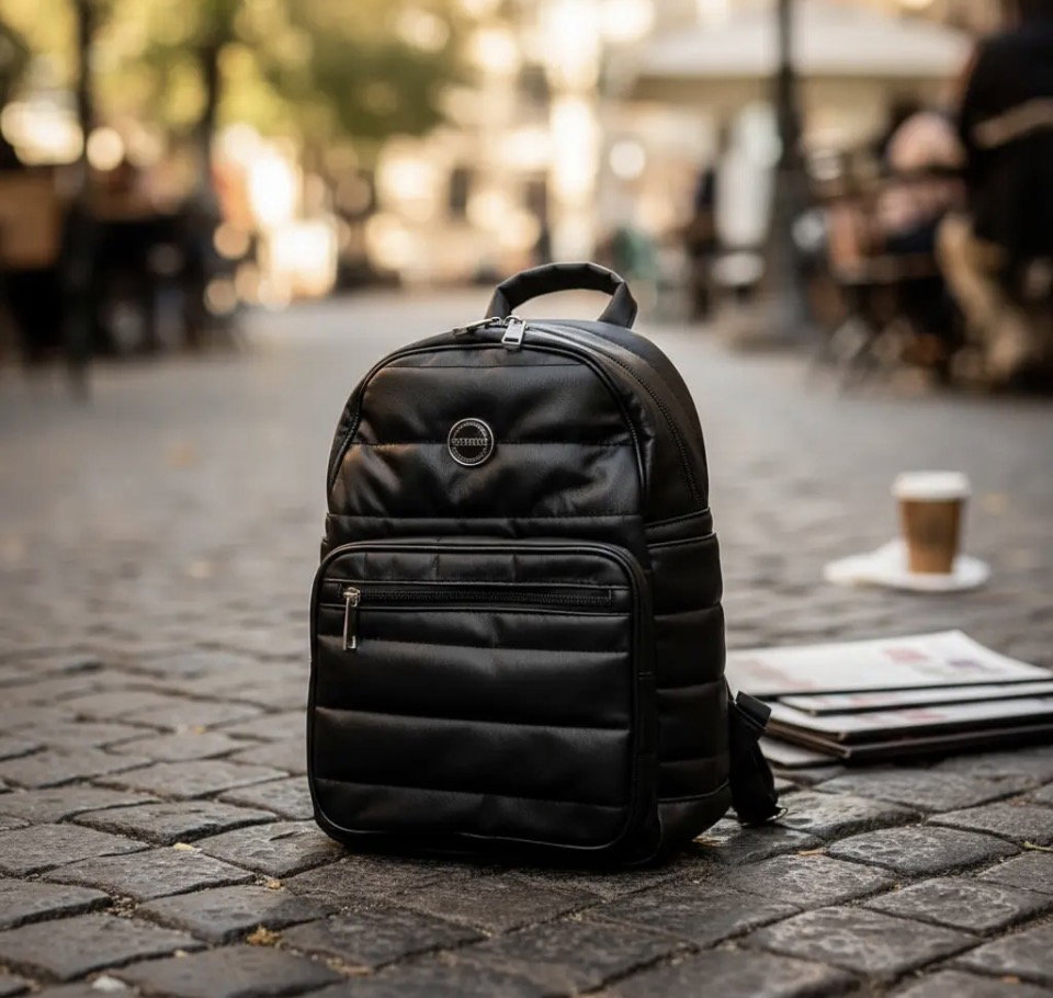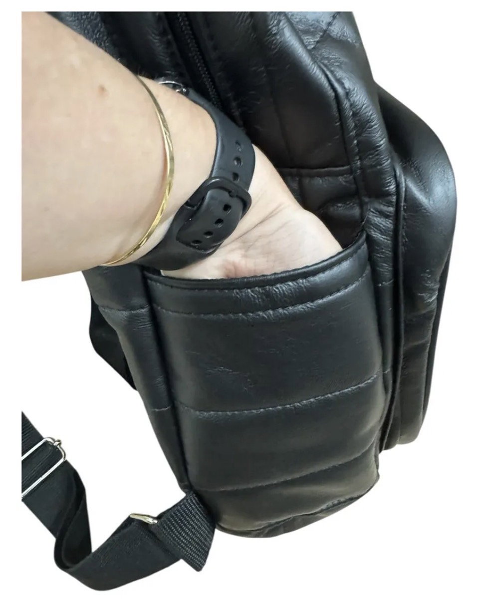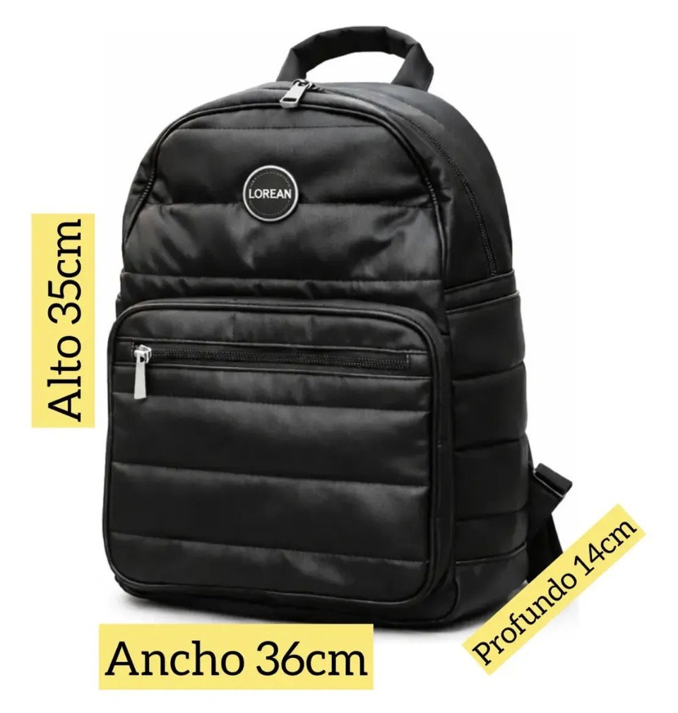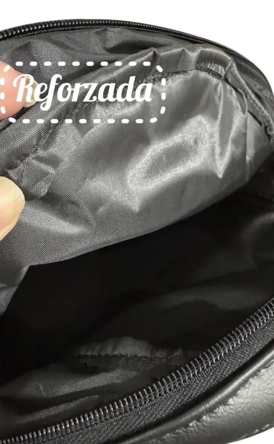 Material simil cuero Puffer, herrajes en color niquel , toda forrada en su interior y dos bolsillos laterales .