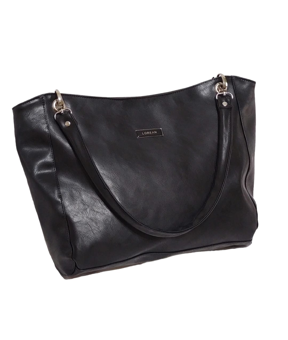 Material simil cuero PU , los herrajes en color niquel , cierre en la boca principal y bolsillo interno con cierre . Toda forrada en tela silver impermeable.