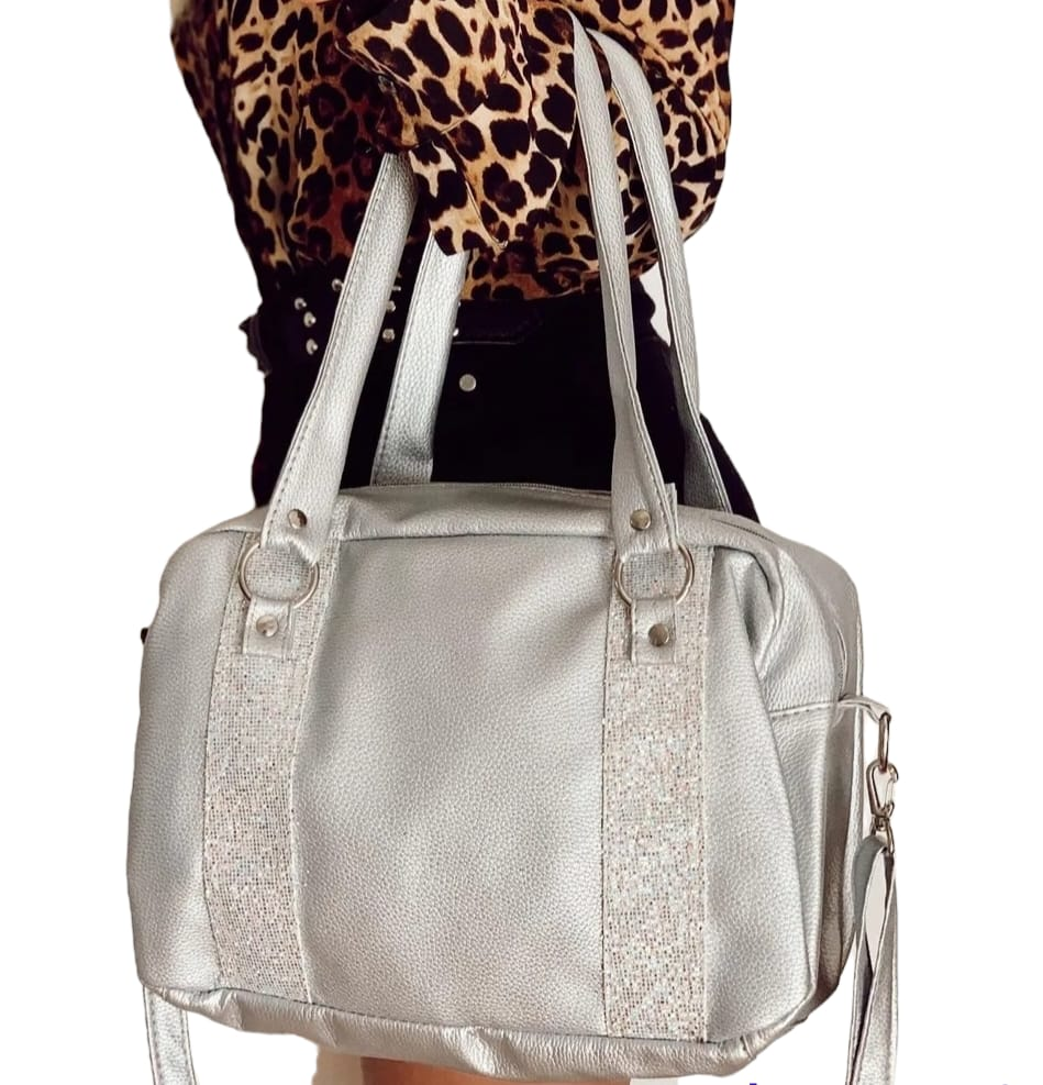 Material simil cuerp PU, los herrajes color niquel , toda forrada en su interior con bolsillo interno y uno en la parte trasera con cierre.