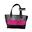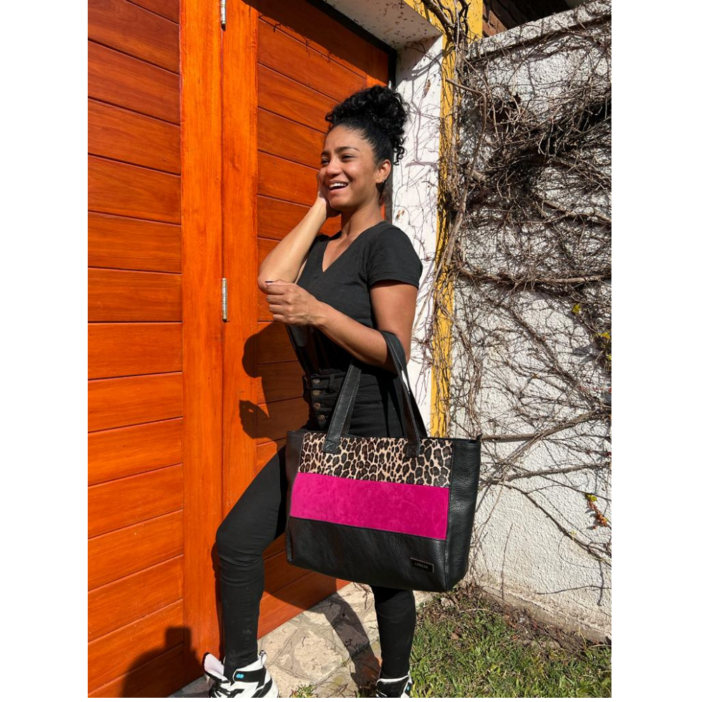 Material simil cuero Pu combinada con animal print y gamuza fucsia . Forrada con tela silver impermeable y tiene un bolsillo interno .
