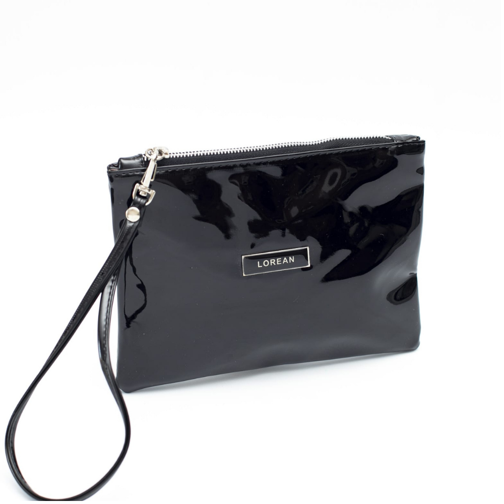 Material simil cuero charol, todo forrado , con cierre metálico y una correa para poder colgar en la mano .