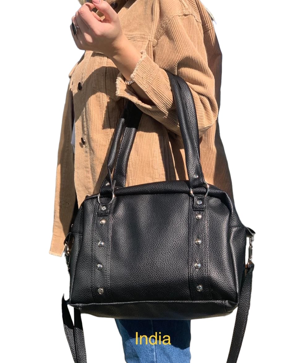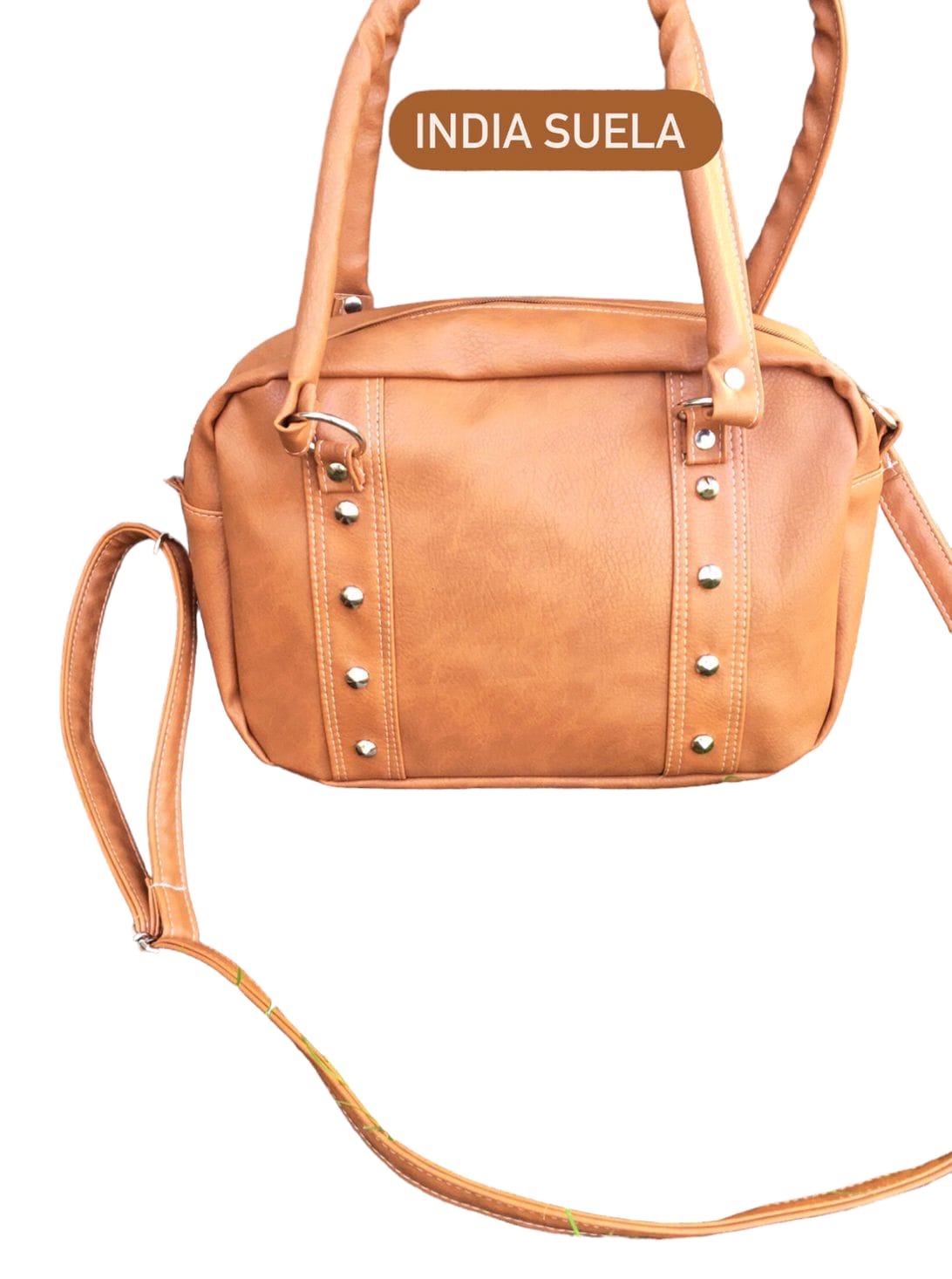 Material simil cuero con charol, toda forrada en su interior con bolsillo interno y uno externo en la parte trasera . Todos sus herrajes en color níquel y doble correa , cortas y una larga para usar como bandolera .